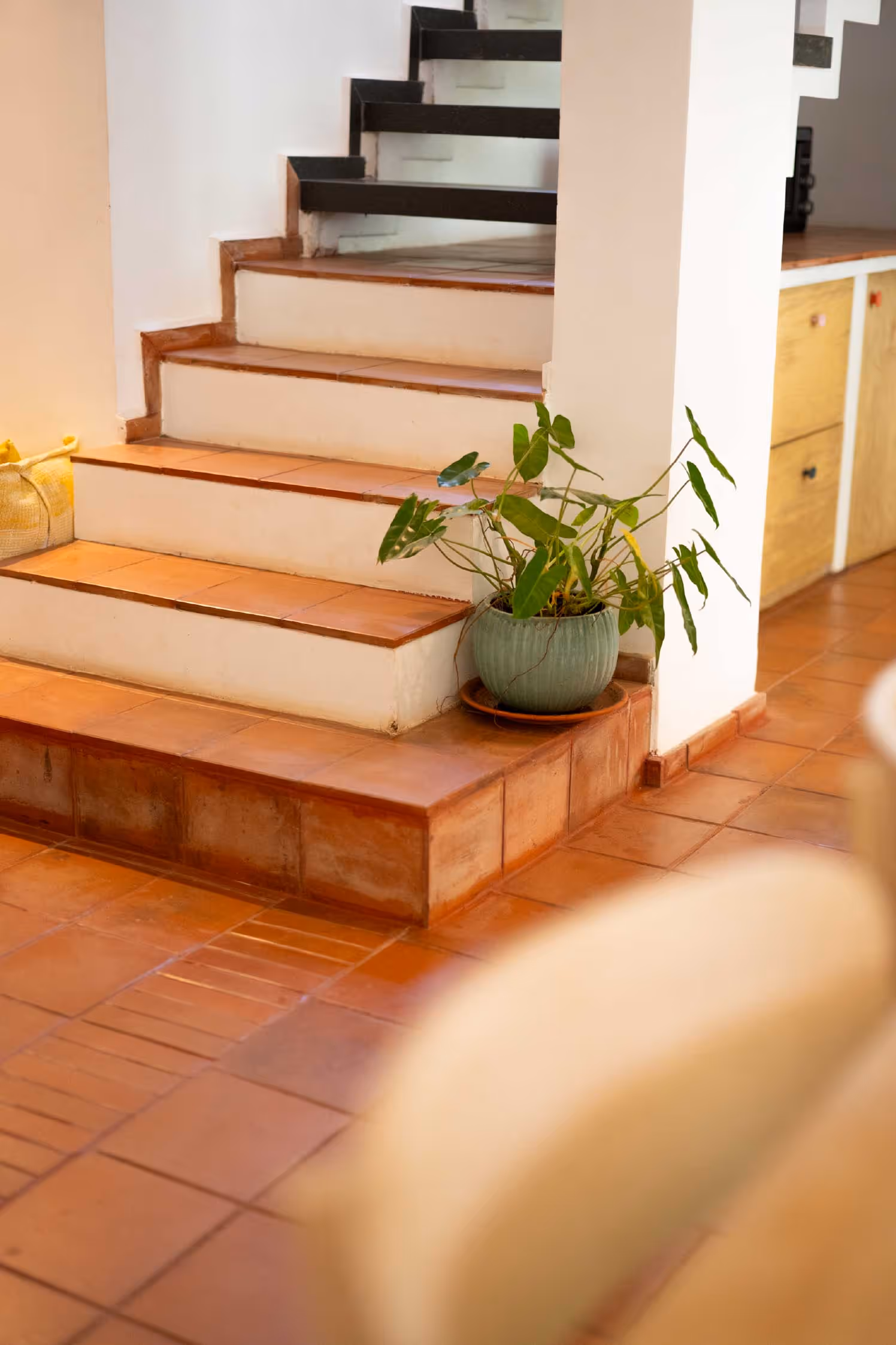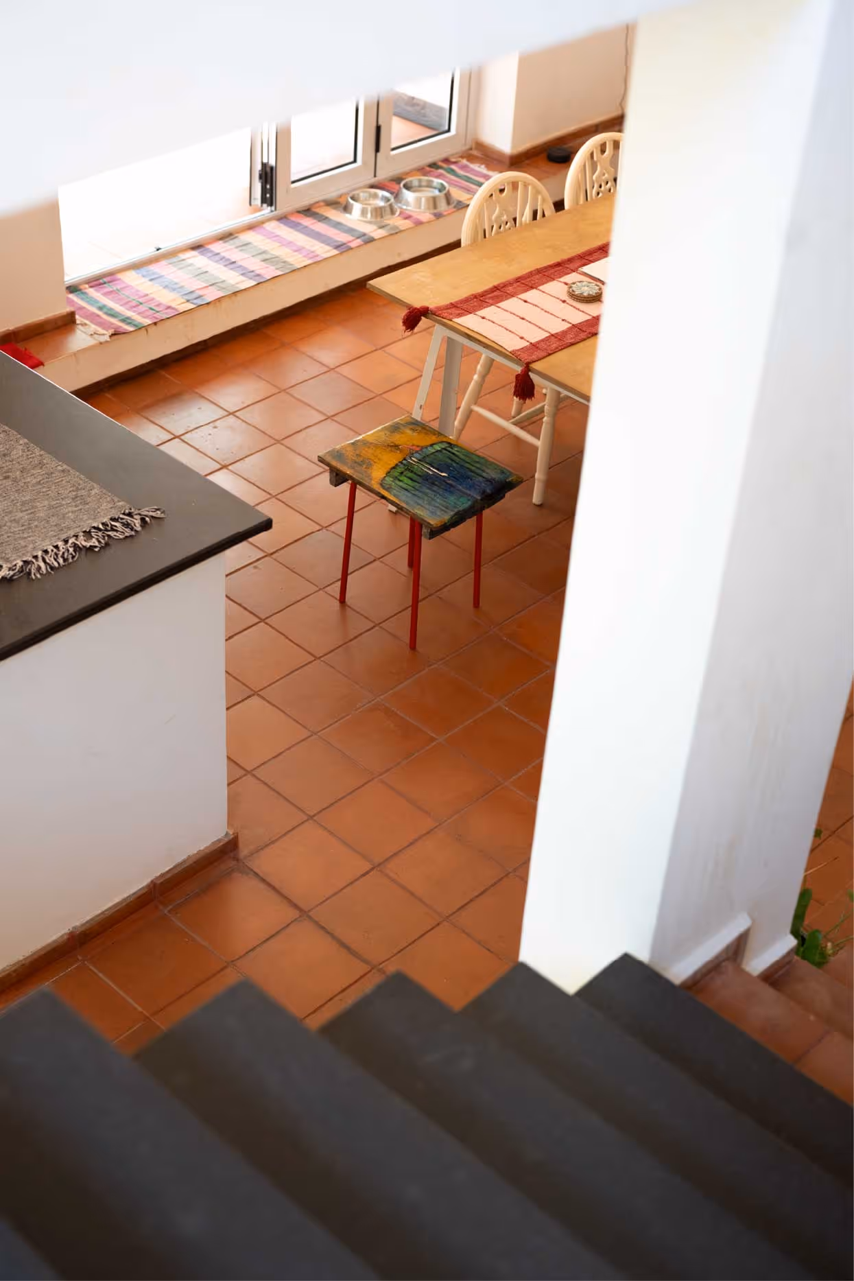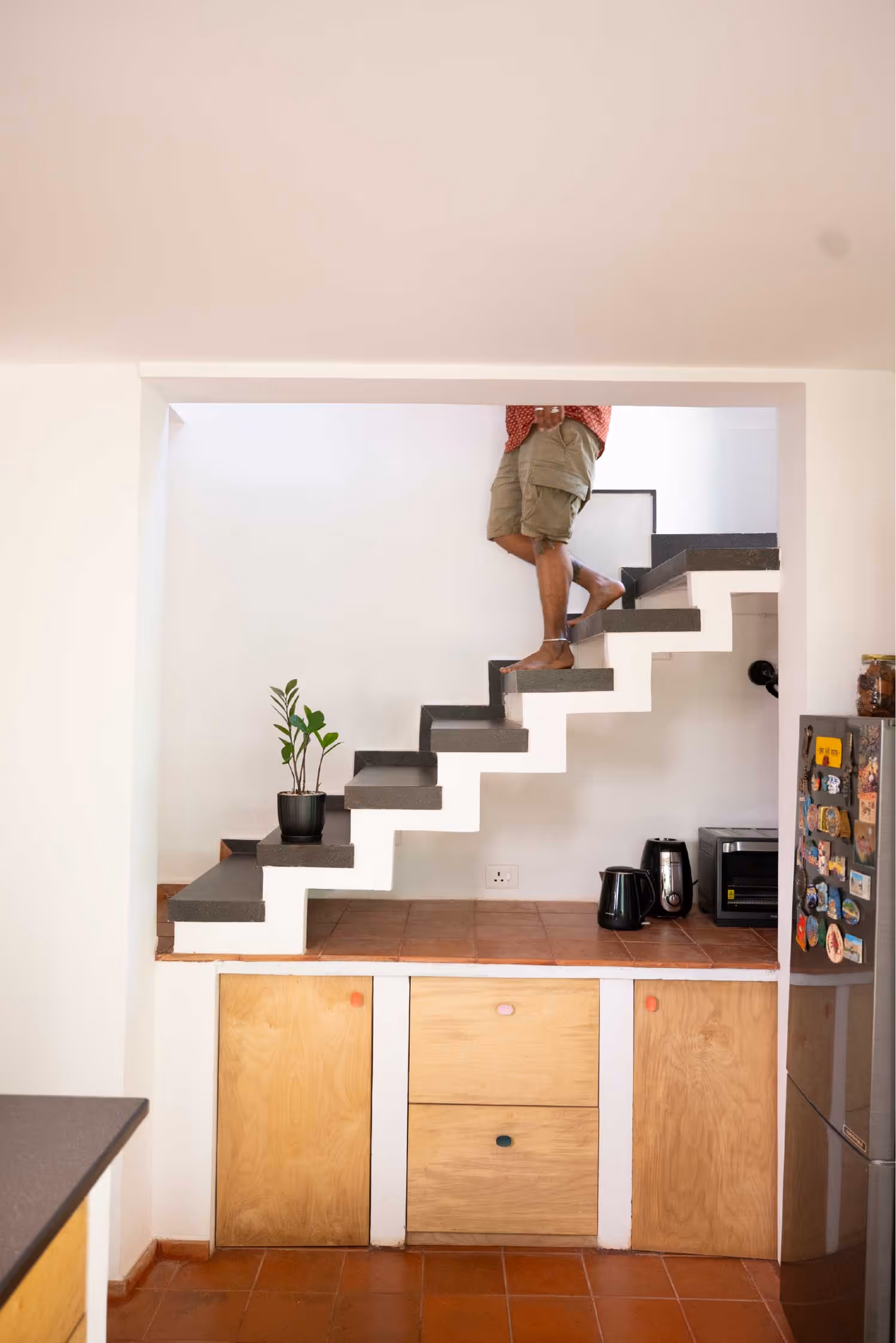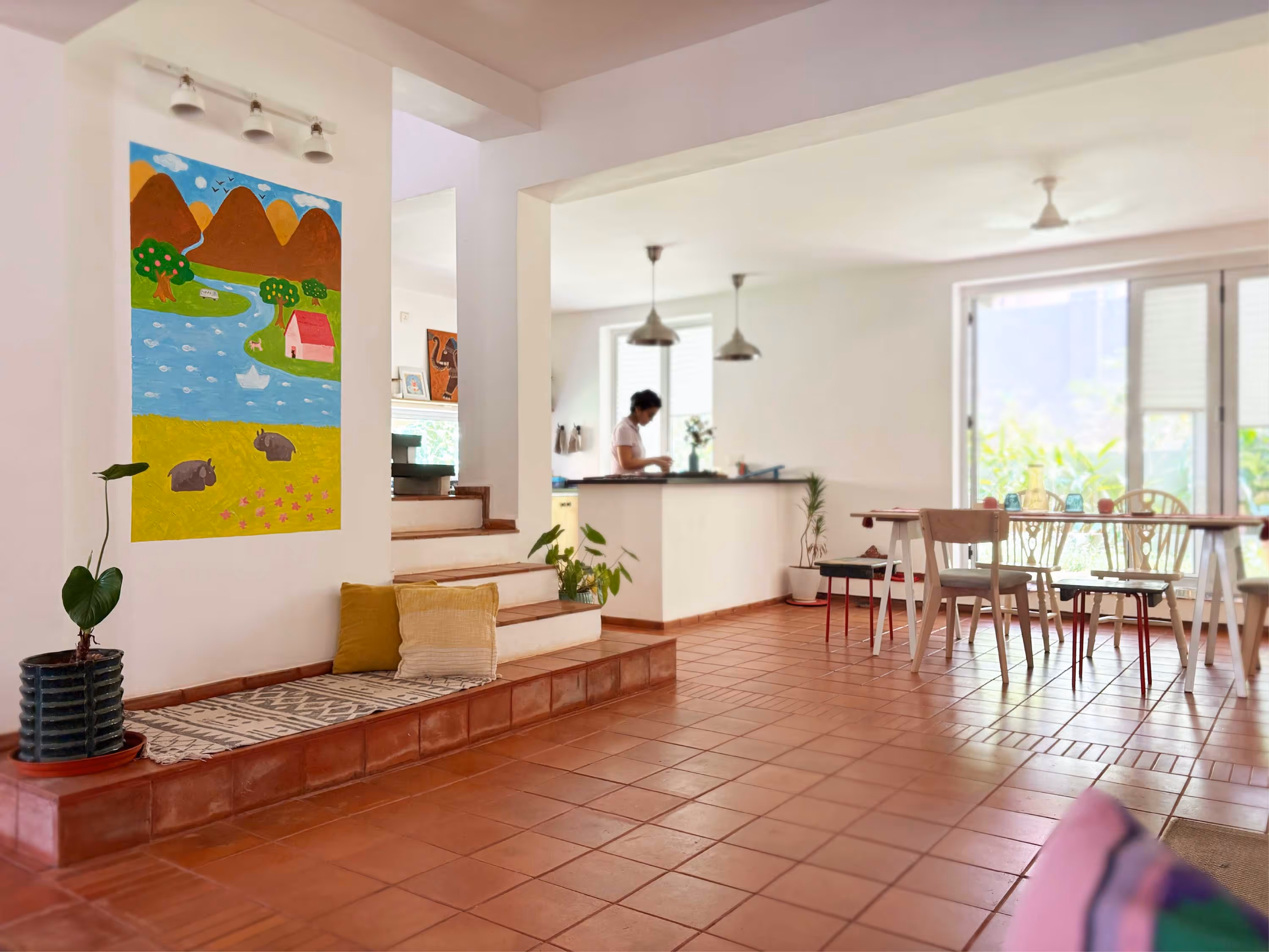 The red terracotta floors arrive like a bold first stroke, grounding, imperfect, alive. The flooring anchors the space, setting the tone for a home that embraces colour and imperfection. The walls remain intentionally white, not as a neutral choice but as a conscious canvas, holding art, experiments, and everything in progress. Red brick, once a nostalgic moodboard desire of the owner, finds its way into the home without compromise.